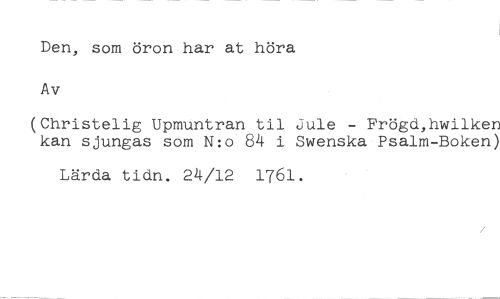 Den, som öron har at höra Av //// (Christelig Upmuntran til Jule - Frögd,hwilken kan sjungas som N:o 84 i Swenska Psalm-Boken) //// Lärda tidn. 24/12 1761.