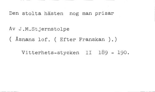 Den stolta hästen nog man prisar //// Av J.M.Stjernstolpe //// ( Åsnans lof. ( Efter Franskan ).) //// Vitterhets-stycken II 189 - 190.