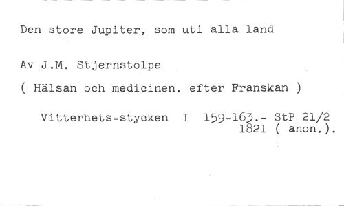 Den store Jupiter, som uti alla land //// Av J.M. Stjernstolpe //// ( Hälsan och medicinen. //// Vitterhets-stycken efter Franskan ) //// 159-163.- StP 21/2 1821 ( anon.).