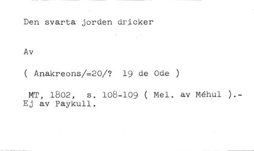 Den svarta jorden dricker //// Av //// ( Anakreons/=20/? 19 de Ode //// MT, 1802, s. 108-109 ( Mel. av M6hul ).Ej av Paykull.