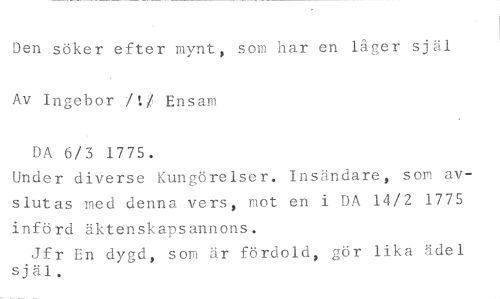 Den söker efter mynt, som har en låger själ Av Ingebor /1/ Ensam //// DA 6/3 1775. //// Under diverse Kungörelser. Insändare, som avslutas med denna vers, mot en i DA 14/2 1775 införd äktenskapsannons. //// Jfr En dygd, som är fördold, gör lika ädel själ.