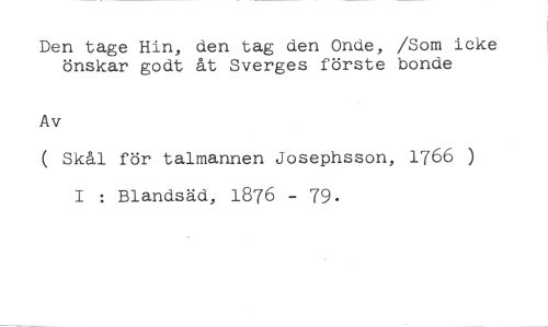 Den tage Hin, den tag den Onde, /Som icke önskar godt åt Sverges förste bonde //// Av //// ( Skål för talmannen Josephsson, 1766 ) I : Blandsäd, 1876 - 79.