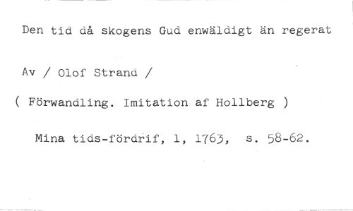 Den tid då skogens Gud enwäldigt än regerat //// Av / Olof Strand / ////( Förwandling. Imitation af Hollberg ) //// Mina tids-fördrif, 1, 1 763, s. 58-62.
