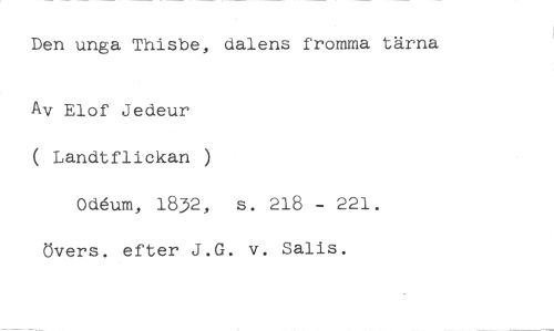 Den unga Thisbe, dalens fromma tärna //// Av Elof Jedeur ( Landtflickan //// OcAum, 1832, s. 218 - 221. Övers. efter J.G. v. Salis.