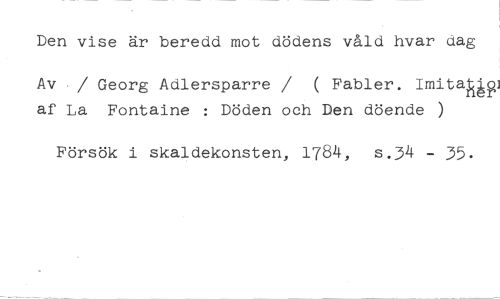 Den vise är beredd mot dödens våld hvar dag //// Av / Georg Adlersparre / ( Fabler. Imitak) af La Fontaine : Döden och Den döende ) //// Försök i skaldekonsten, 1784, s.34 - 35.