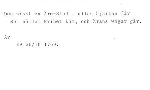 Den visst en Äre-Stod i allas hjärtan får //// Som håller Frihet kär, och Ärans wägar går. //// Av //// DA 26/10 1769.