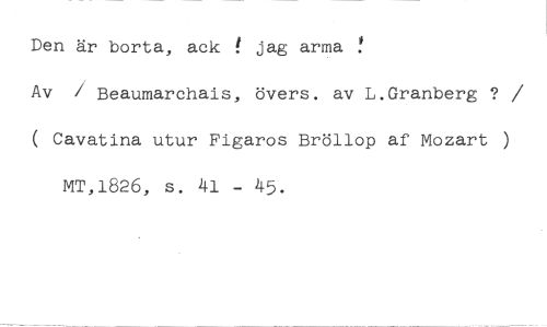 Den är borta, ack ! jag arma ! //// Av / Beaumarchais, övers, av L.Granberg ? / ( Cavatina utur Figaros Bröllop af Mozart ) MT,1826, s. 41 - 45.