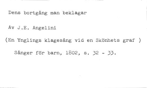 Dens bortgång man beklagar //// Av J.E. Angelini //// (En Ynglings klagesång vid en Skönhets graf ) Sånger för barn, 1802, s. 32 - 33.