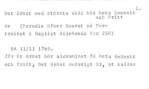 1. //// Det Bröst med största skäl bör heta Swenskt //// och Fritt //// Av (Parollie öfwer Swaret på Por- //// traitet i Dagligt Allehanda N:o 250) //// DA 11/11 1769. //// Jfr Et Bröst bör aldraminst få heta Swänskt och fritt; Det Bröst owärdigt är, at kallas
