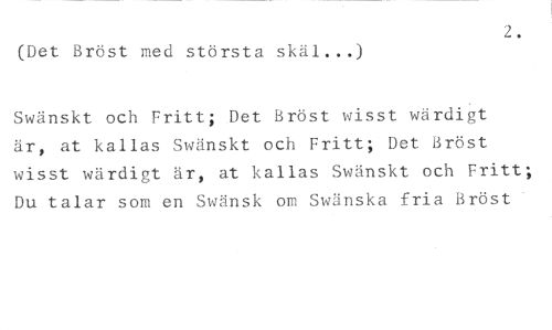 2. //// (Det Bröst med största skäl...) //// Swänskt och Fritt; .Det Bröst wisst wärdigt är, at kallas Swänskt och Fritt;- Det Bröst wisst wärdigt är, at kallas Swänskt och Fritt; Du talar som en Swänsk om Swänska fria Bröst