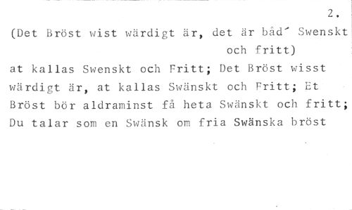 2. //// (Det Bröst wist wärdigt är, det är båd' Swenskt //// och fritt) //// at kallas Swenskt och Fritt; Det Bröst wisst wärdigt är, at kallas Swänskt och Fritt; Et Bröst bör aldraminst få heta Swänskt och fritt; Du talar som en Swänsk om fria Swänska bröst