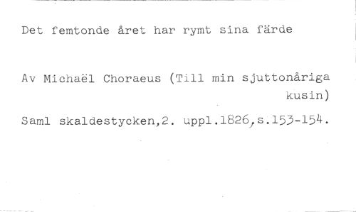 Det femtonde året har rymt sina färde //// Av Michaäl Choraeus (Till min sjuttonåriga //// kusin) //// Sami skaldestycken, 2. upp1.1826is.153-154.