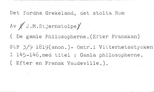 Det fordna Grekeland, det stolta Rom //// Av / .M.Stjernstolpe / ////( De gamle Philosopherne.(E ter Franskan) //// StP 3/9 1819(anon.)- Omtr.i Vitterhetsstycken 1145-146,med titel : Gamla philosopherne. ( Efter en Fransk Vaudeville.).
