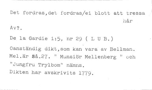Det fordras,det fordras/ei blott att tressa //// hår //// Av?. //// De la Gardie i:5, nr 29 ( L U B.) //// Oanständig dikt,som kan vara av Bellman. Mel.är Så.27. " Munsiör Mellenberg " och "Jungfru Trylbom" nämns. //// Dikten har avskrivits 1779.