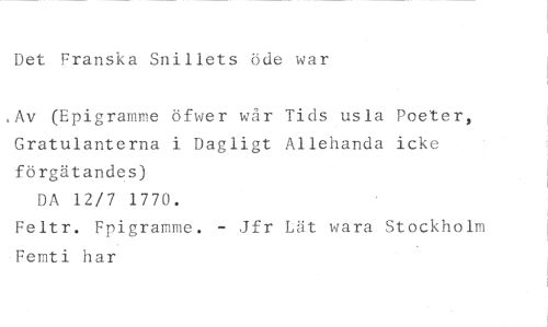 Det Franska Snillets öde war //// ,Av (Epigramme öfwer wår Tids usla Poeter, Gratulanterna i Dagligt Allehanda icke förgätandes) //// DA 12/7 1770. //// Feltr. Fpigramme. - Jfr Lät wara Stockholm Femti har