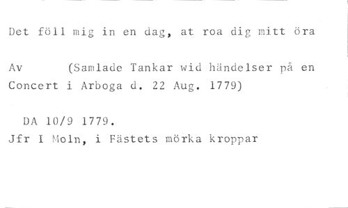 Det föll mig in en dag, at roa dig mitt öra //// Av (Samlade Tankar raid händelser på en //// Concert i Arboga d. 22 Aug. 1779) //// DA 10/9 1779. //// Jfr I Moln, i Fästets mörka kroppar