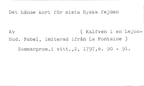 Det hände kort för sista Ryska fejden //// Av ( Kalfven i en Lejon- //// hud. Fabel, imiterad ifrån La Fontaine ) //// Sommarprom.i vitt.,2, 1797,s. 90 - 91.