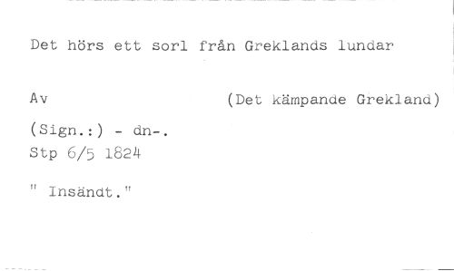 Det hörs ett sorl från Greklands lundar //// Av (Det kämpande Grekland) //// (Sign.:) - dn-. Stp 6/5 1824 //// " insändt."