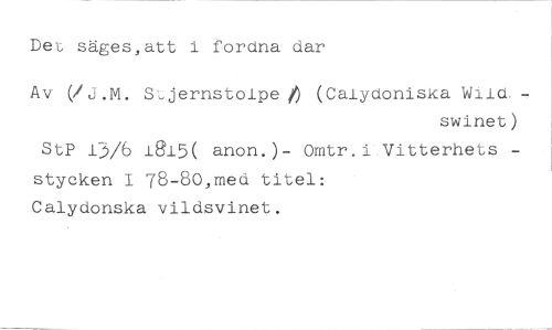 Det säges,att i fordna dar //// Av VJ.M. Stjernstolpe (Calydoniska Wiid, //// swinet) //// StP 13/6 1915( anon. )- Omtr. i Vitterhets stycken 1 78-80,med titel: //// Calydonska vildsvinet.