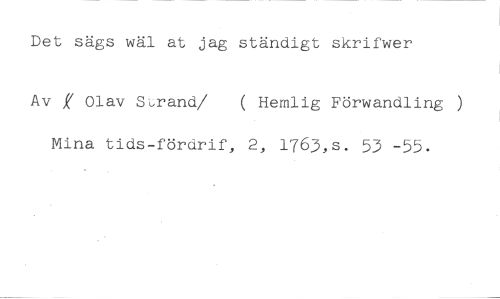 Det sägs wäl at jag ständigt skrifwer //// Av K Olav Surand/ ( Hemlig Förwandling ) //// Mina tids-fördrif, 2, 1763,s. 53 -55.