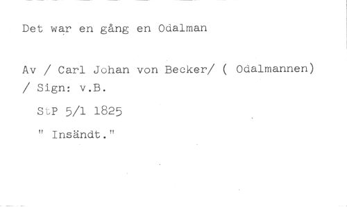 Det war en gång en Odalman //// Av / Carl Johan von Becker/ ( Odalmannen) / Sign: v.B. //// StP 5/1 1825 " Insändt."
