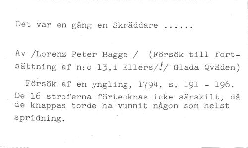 Det var en gång en Skräddare //// Av /Lorenz Peter Bagge / (Försök till fortsättning af n:o 13,i Ellers/!/ Glada Qväden) //// Försök af en yngling, 1794, s. 191 - 196. //// De 16 stroferna förtecknas icke särskilt, då de knappas torde ha vunnit någon som helst //// spridning.