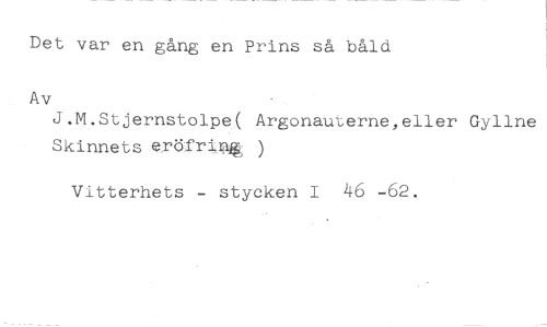 Det var en gång en Prins så båld //// Av //// J.M.Stjernstolpe( Argonauterne,eller Gyllne //// Skinnets eröfri11714 ) //// Vitterhets - stycken I 46 -62.