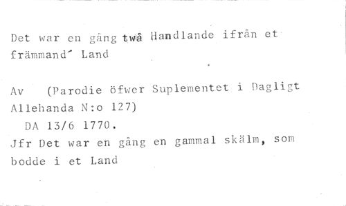 Det war en gång t Handlande ifrån et- //// främmand' Land //// Av (Parodie öfwer Suplementet i Dagligt //// Allehanda N:o 127) //// DA 13/6 1770. //// Jfr Det war en gång en gammal skälm, som //// bodde i et Land