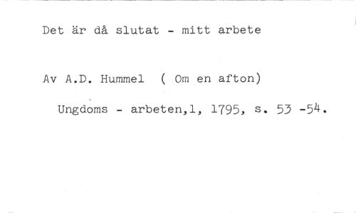 Det är då slutat - mitt arbete //// Av A.D. Hummel ( Om en afton) //// Ungdoms - arbeten,l, 1795, s• 53 -54•
