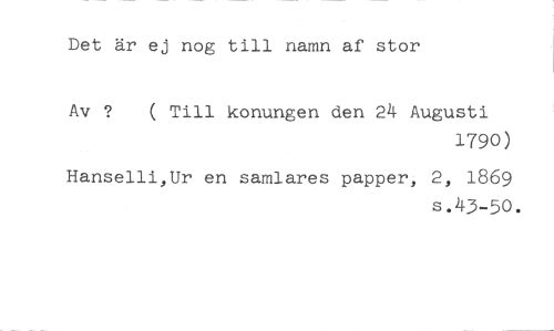 Det är ej nog till namn af stor //// Av ? ( Till konungen den 24 Augusti //// 1790) //// Hanselli,Ur en samlares papper, 2, 1869 //// s.'3-50.
