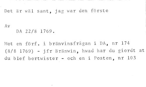 Det är wäl sant, jag war den förste //// Av //// DA 22/8 1769. //// Mot en förf. i bränvinsfrågan i DA, nr 174 //// (8/8 1769) - jfr Bränwin, hwad har du giordt at du blef bortwister - och en i Posten, nr 103