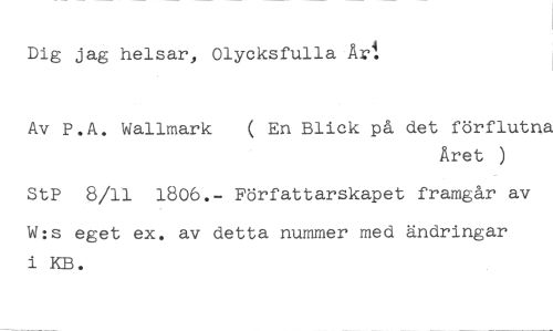 Dig jag helsar, Olycksfulla Art //// Av P.A. Wallmark ( En Blick på det förflutna //// Året //// StP 8/11 1806.- Författarskapet framgår av //// W:s eget ex. av detta nummer med ändringar i KB.
