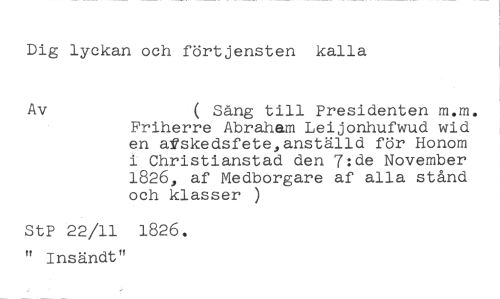Dig lyckan och förtjensten kalla //// Av ( Säng till Presidenten m.m. //// Friherre Abraham Leijonhufwud wid en afskedsfete,anställd för Honom i Christianstad den 7:de November 1826, af Medborgare af alla stånd och klasser ) //// StP 22/11 1826. " Insändt"