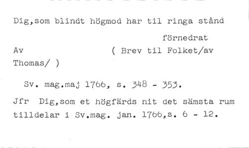 Dig,som blindt högmod har til ringa stånd //// förnedrat //// Av ( Brev til Folket/av //// Thomas/ ) //// Sv. mag.maj 1766, s. 348 - 353. //// Jfr Dig,som et högfärds nit det sämsta rum tilldelar i Sv.mag. jan. 1766,s. 6 - 12.