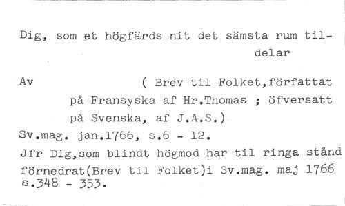 Dig, som et högfärds nit det sämsta rum til- //// delar //// Av ( Brev til Folket,författat //// på Fransyska af Hr.Thomas ; öfversatt på Svenska, af J.A.S.) //// Sv.mag. jan.1766, s.6 - 12. //// Jfr Dig,som blindt högmod har til ringa stånd //// förnedrat(Brev til Folket)i Sv.mag. maj 1766 s.)48 - 353.