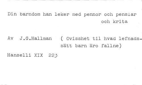 Din barndom han leker med pennor och penslar //// och krita //// Av J.G.Hallman ( Ovisshet til kvad lefnads- //// sätt barn äro fallne) //// Hanselli XIX 223