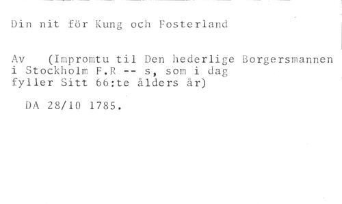 Din nit för Kung och Fosterland //// Av (Impromtu til Den hederlige Borgersmannen //// i Stockholm F.R s, som i dag //// fyller Sitt 66:te ålders år) //// DA 28/10 1785.
