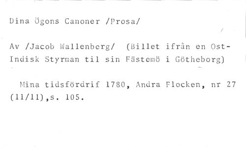 Dina Ögons Canoner /Prosa //// /Av /Jacob Wallenberg/ (Gillet ifrån en Ost-Indisk Styrman til sin Fästemö i Götheborg) //// Mina tidsfördrif 1780, Andra Flocken, nr 27 (11/11),s. 105.
