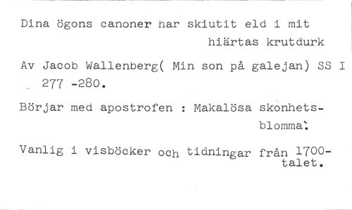 Dina ögons canoner har skiutit eld i mit //// hiärtas krutdurk //// Av Jacob Wallenberg( Min son på galejan) SS 277 -280. //// Börjar med apostrofen : Makalösa skonhets- //// blomma: //// Vanlig i visböcker och tidningar från 1700- //// talet.