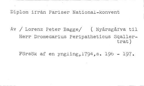 Diplom irrån Pariser National-konvent //// Av / Lorenz Peter Bagge/ ( Nyårsgårva til //// Herr Dromeaarius Peripatheticus Sclaller- //// trat) //// Försök af en yngling,1794,s. 19b - 197.