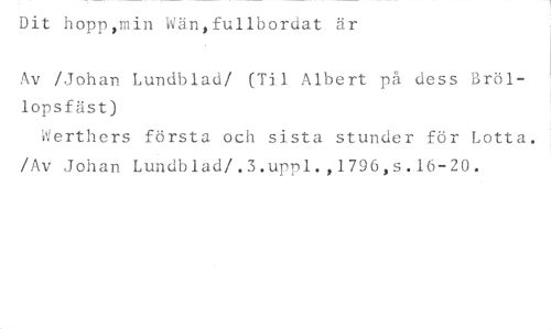Dit hoppmin Wän,fullbordat är //// Av /Johan Lundblad/ (Til Albert på dess Bröllopsfäst) //// Werthers första och sista stunder för Lotta. /Av Johan Lundblad/.3.uppl.,1796,s.16-20.
