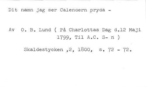 Dit namn jag ser Calendern pryda - //// Av 0. B. Lund ( På Charlottas Dag d.12 Maji 1799, Til A.C. S- n ) //// Skaldestycken ,2, 1800, s. 72 - 72.