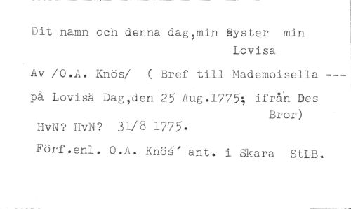 Dit namn och denna daggmin Syster min //// Lovisa //// Av /O.A. Knös/ ( Bref till Mademoisella --- //// på Lovisä Dag,den 25 Aug.1775; ifrån Des //// Bror) //// HvN? HvN? 31/8 1775. //// Förf.enl. O.A. Knöå' ant. i Skara StLB.
