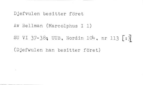 Djefvulen besitter föret //// Av Bellman (Marcolphus I 1) //// SU VI 37-38; UUB, Nordin 104, nr 113 E:ä (Djefwulen han besitter föret)