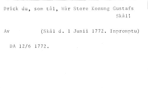 Drick du, som tål, blår Store Konung Gustafs //// Skål! //// Av (Skål d. 1 Junii 1772. Inpromptu) //// DA 12/6 1772.