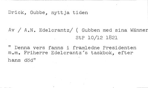 Drick, Gubbe, nyttja tiden //// Av / A.N. Edelcrantz/ ( Gubben med sina Wänner //// StP 10/12 1821 //// " Denna vers fanns i framledne Presidenten m.m. Friherre Edelcrantz's taskbok, efter //// hans död"