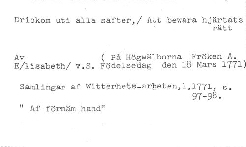 Drickom uti alla safter,/ Aut bewara hjärtats //// rätt //// Av ( På Högwälborna Fröken A. //// E/lisabeth/ v.S. Födelsedag den 18 Mars 1771) //// Samlingar af Witterhetä-Erbeten,1,1771, s. //// 97-98. //// " Af förnäm hand"