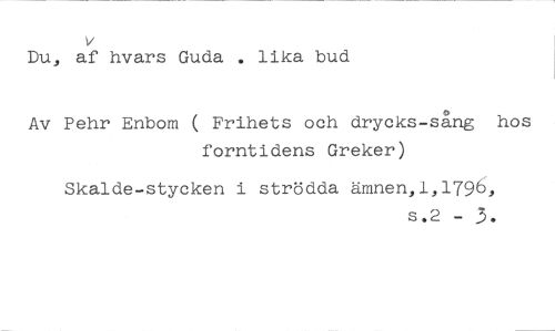 Du, af hvars Guda . lika bud //// Av Pehr Enbom ( Frihets och drycks-sång hos forntidens Greker) //// Skalde-stycken i strödda ämnen,1,1796, //// s.2 - 3.