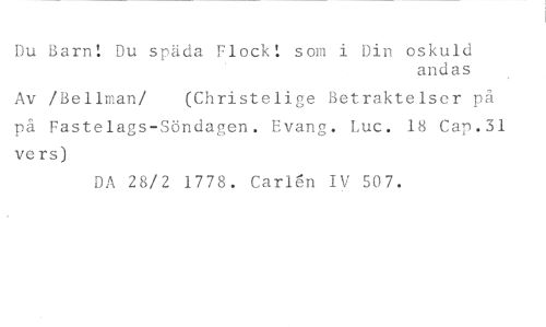 Du Barn! Du späda Flock! som i Din oskuld //// andas //// Av /Bellman/ (Christelige Betraktelser på //// på Fastelags-Söndagen. Evang. Luc. 18 Cap.31 vers) //// DA 28/2 1778. Carlen IV 507.