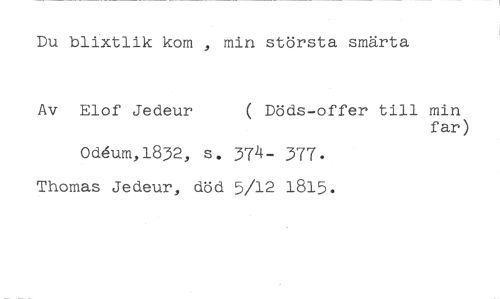 Du blixtlik kom , min största smärta //// Av Elof Jedeur ( Döds-offer till min //// far) //// OcAum,1832, s. 374- 377. Thomas Jedeur, död 5/12 1815.